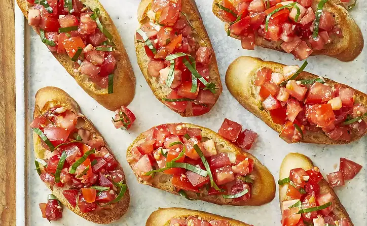 Super easy pick-up appetizer for any type of party! Especially nice at Christmas with the red and green from the tomatoes and basil.