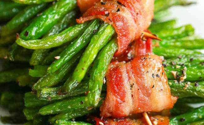 Cut bacon slices in half, and wrap about 5 - 6 green beans with each bacon half slice. Secure with a toothpick and place in casserole dish. Repeat process with remaining bacon and green beans.